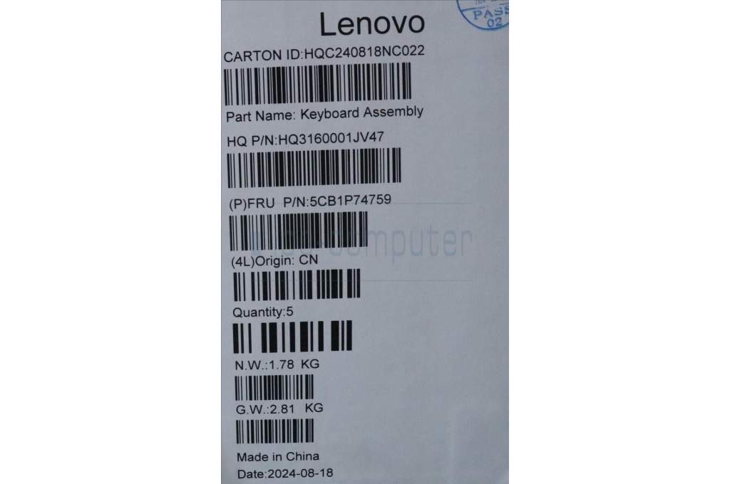 Lenovo 5CB1P74759 C-Cover with keyboard, Hebrew, Luna Grey, Puresight Logo, US
