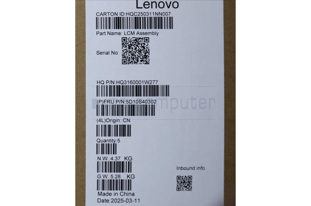 Lenovo 5D10S40302 Lenovo LCD Module, 16", WUXGA, Touch, Glare, IPS, 300nit, 45%NTSC, Luna Grey