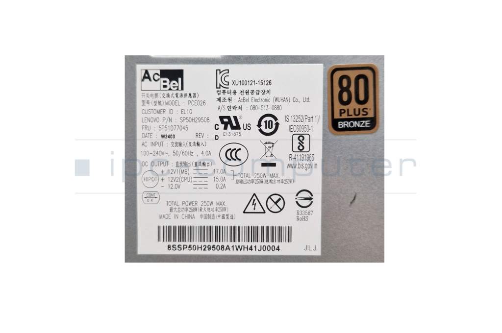 Desktop-PC power supply 250 Watt (Cable length: P1 33 cm / P2 61 cm) original for Lenovo IdeaCentre 300S-11ISH (90D9)